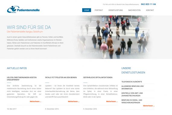 Web site for Patientenstelle Aargau-Solothurn in Aarau, Switzerland, a non-profit organisation that serves the interest of people in case of a conflict with medical services.